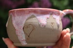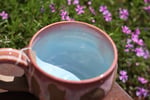 This mug features a pink drip, curled hearts carved on the sides, and a pale blue inside. Holds 14 ounces in total.