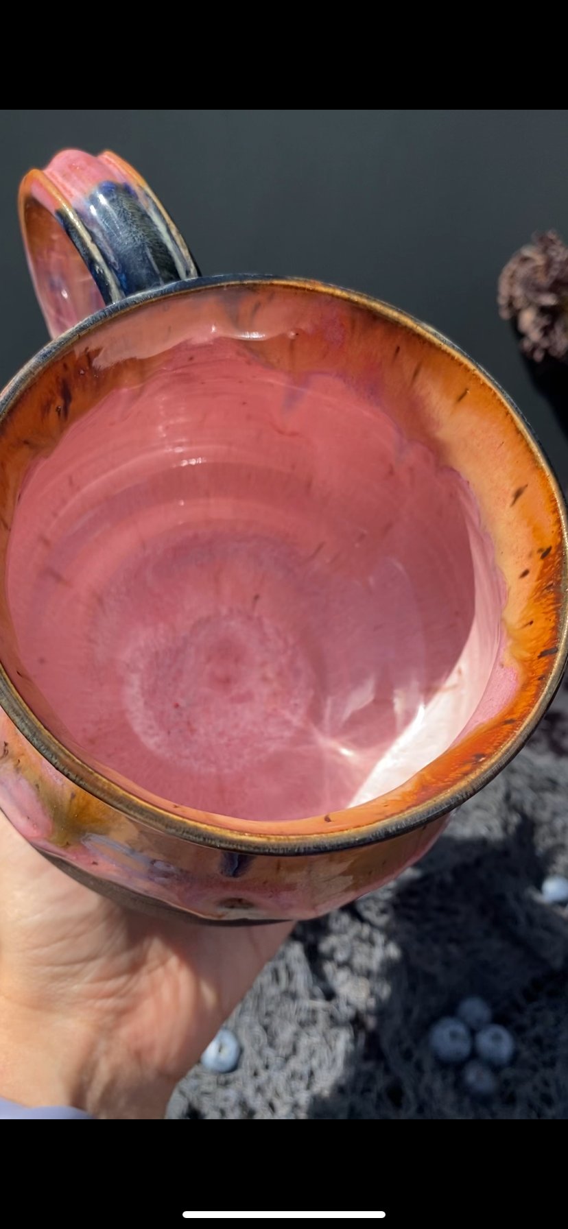 This mug is wheel thrown ceramic and glazed on the inside and outside. It holds 21 ounces to the brim.