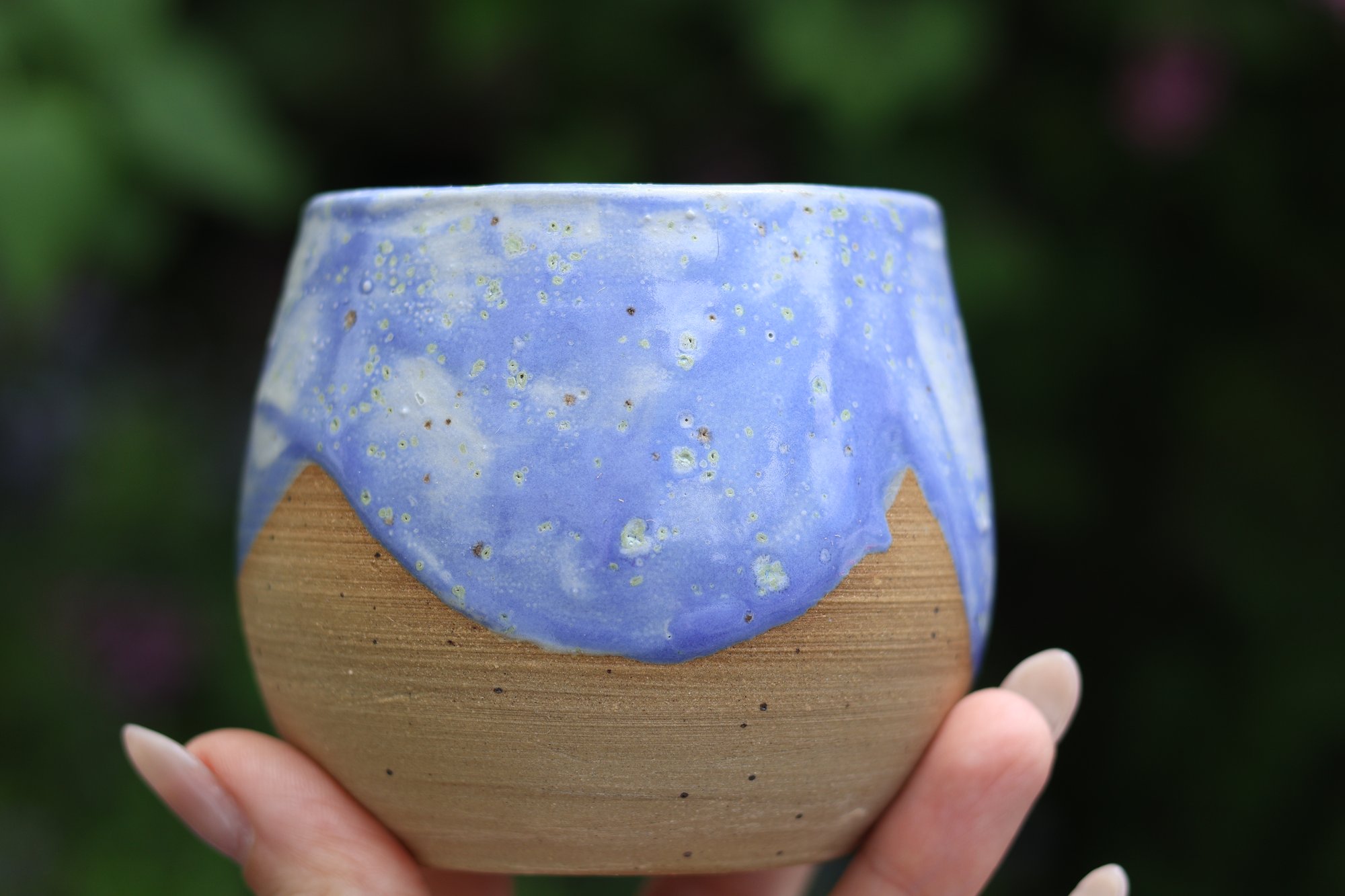 A tumbler with a light blue drip against speckled clay. It holds 8.5 ounces to the brim.