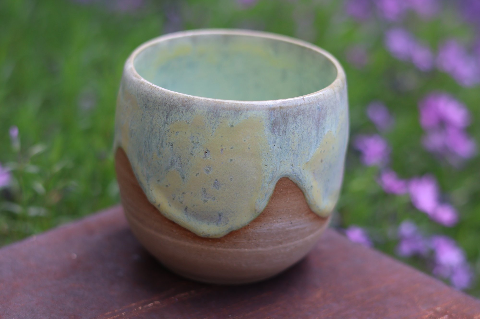 A tumbler featuring a pale green-yellow glaze against speckled clay. It holds 9.5 ounces to the brim.