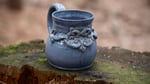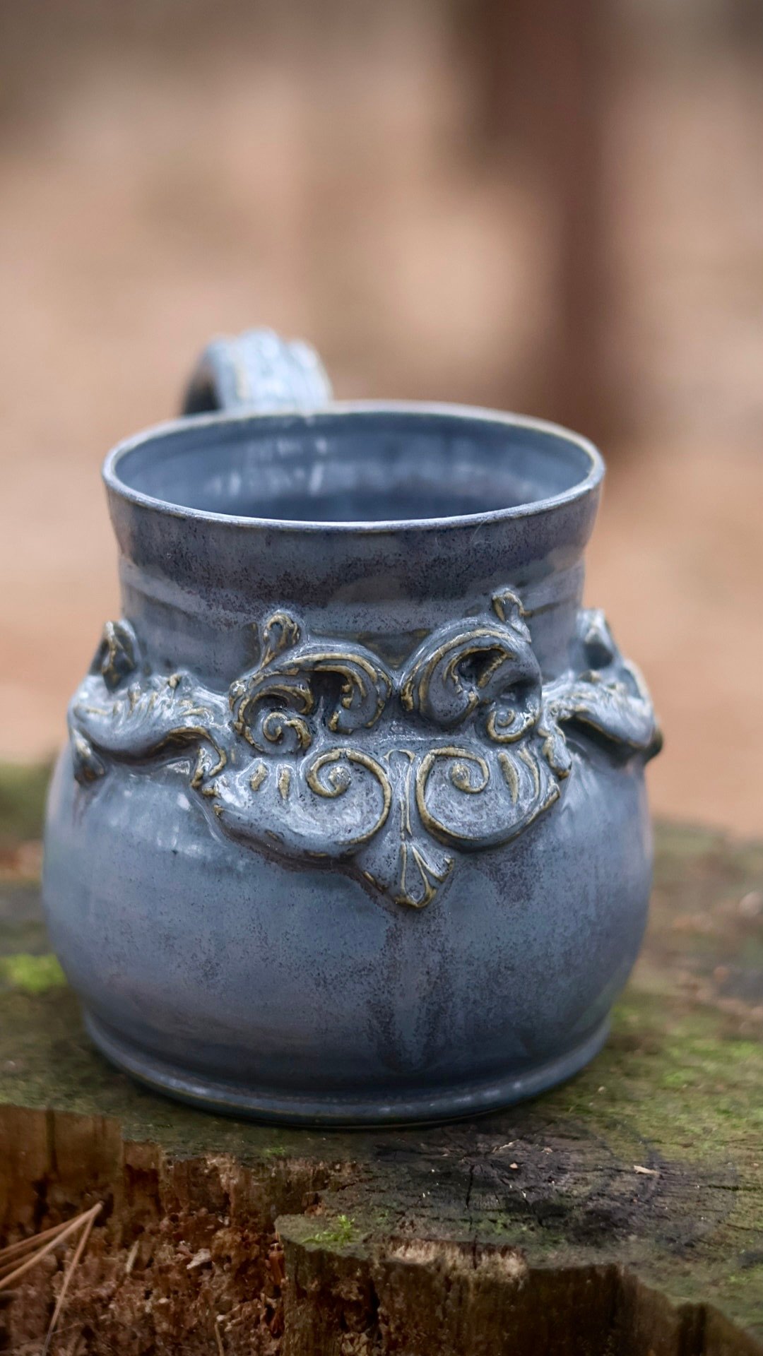 This mug has a denim blue glaze that has an aged feel and a scroll emblem on the front. It holds 13 ounces total.