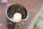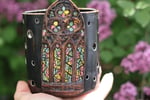 This luminary measures 3.75" wide and tall. It features a subtle sparkly glaze and a hand-painted cathedral window motif. It is meant for a votive, tea light, or LED candle and is sure to cast enchanting shapes and shadows on nearby objects.
