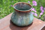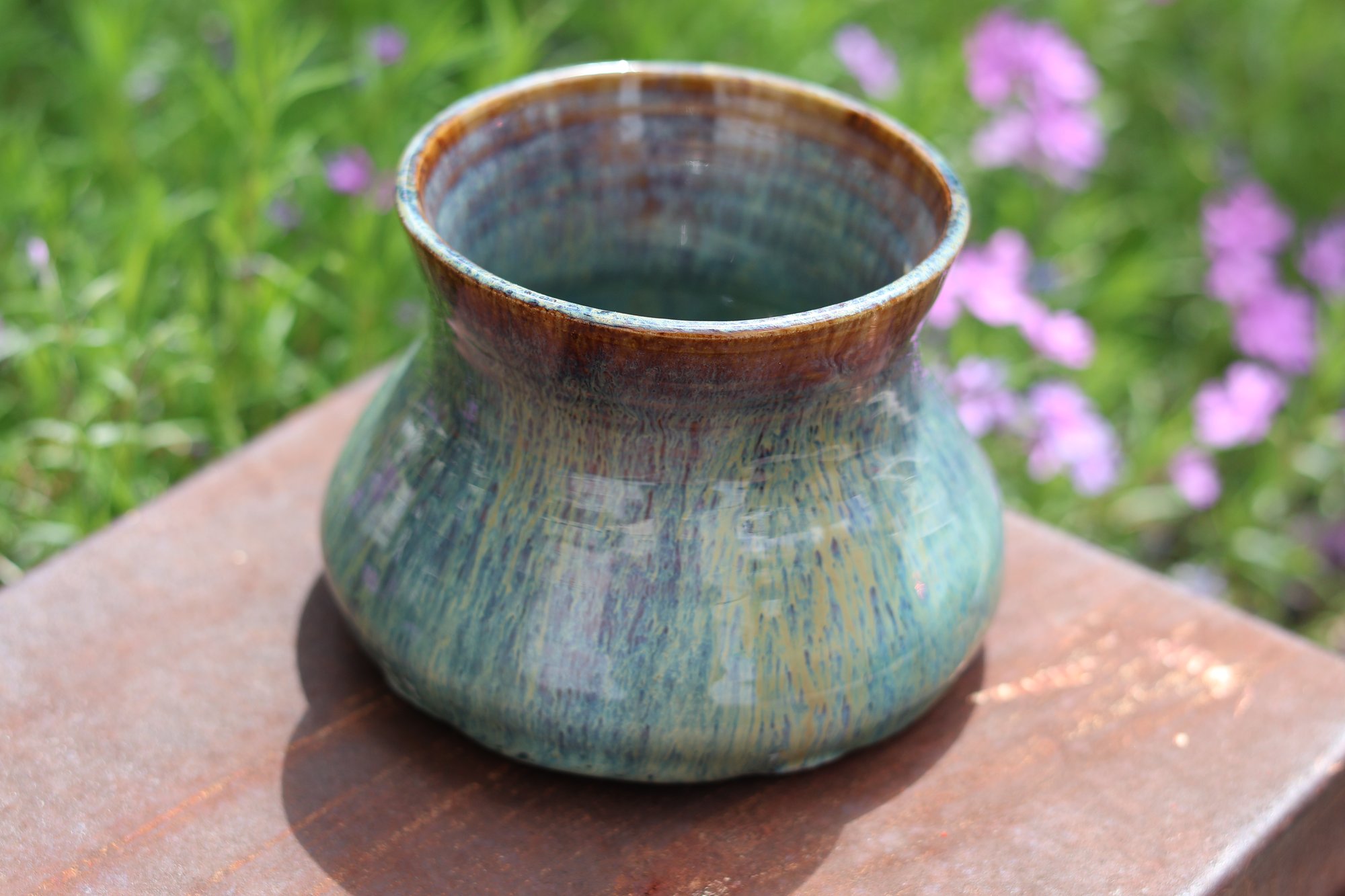 This vase is wheel thrown ceramic and glazed on the inside and outside. It measures 3.25" wide and is 3" tall.