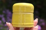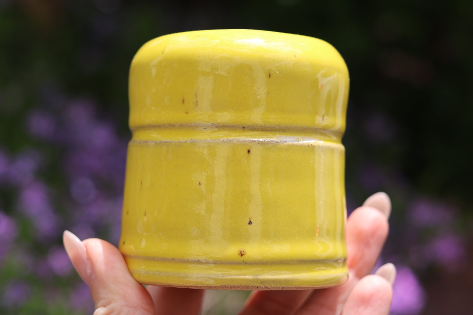 This vase is wheel thrown ceramic and glazed on the inside and outside. It measures 2.5" wide and is 3" tall.