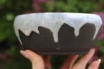 This planter measures 5.5" wide and 2.75" tall. It has a speckled light blue gloss glaze inside and dripping over the outside, with a matte black glaze on the outside. It has small holes for drainage.
