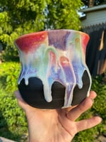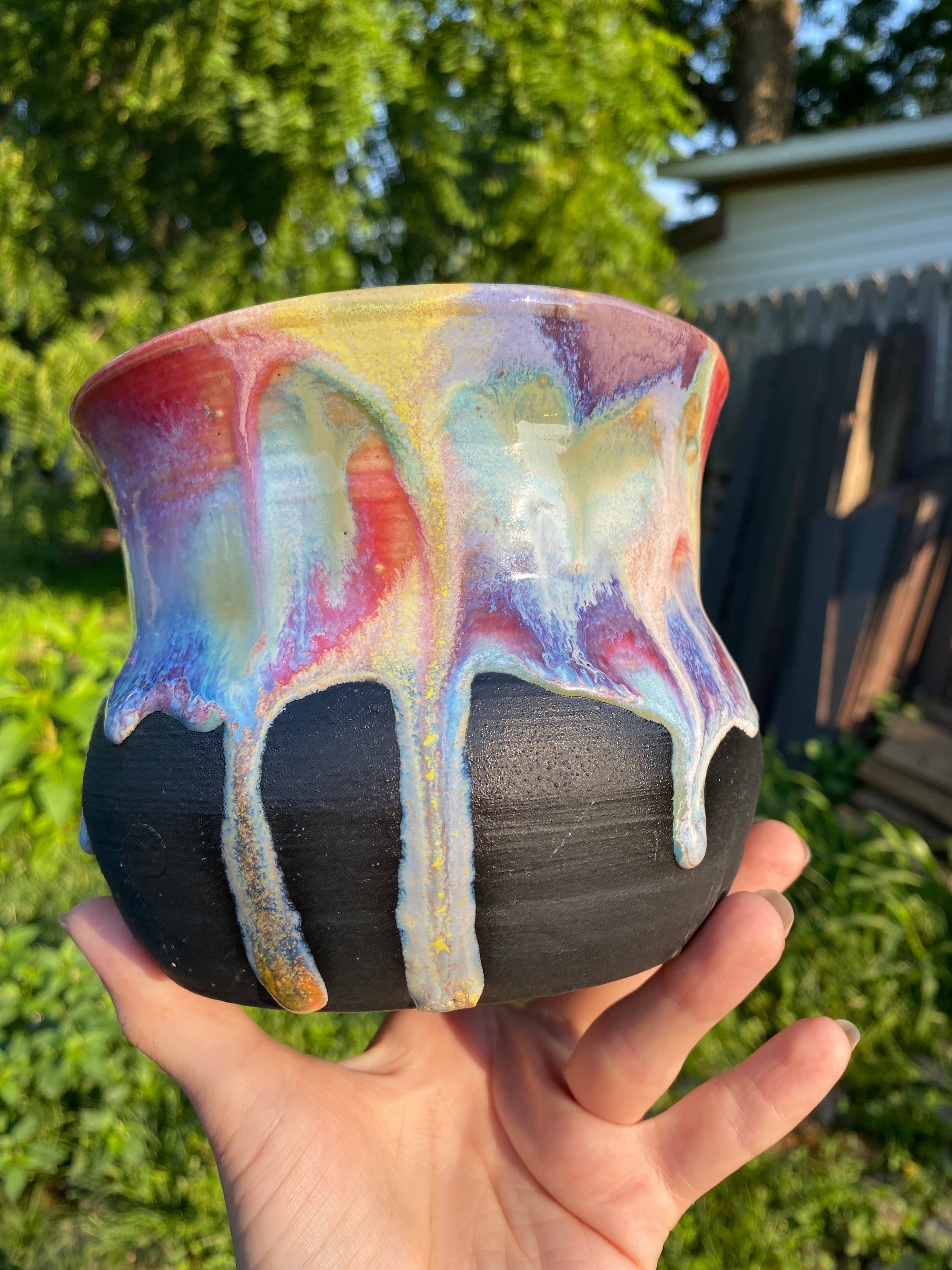 This vase stands 4.5 inches tall and is 5.5 inches wide. It is glazed with a vibrant rainbow drip halfway down on the outside with a matte black glaze on the lower half. The inside has a pastel rainbow glaze.