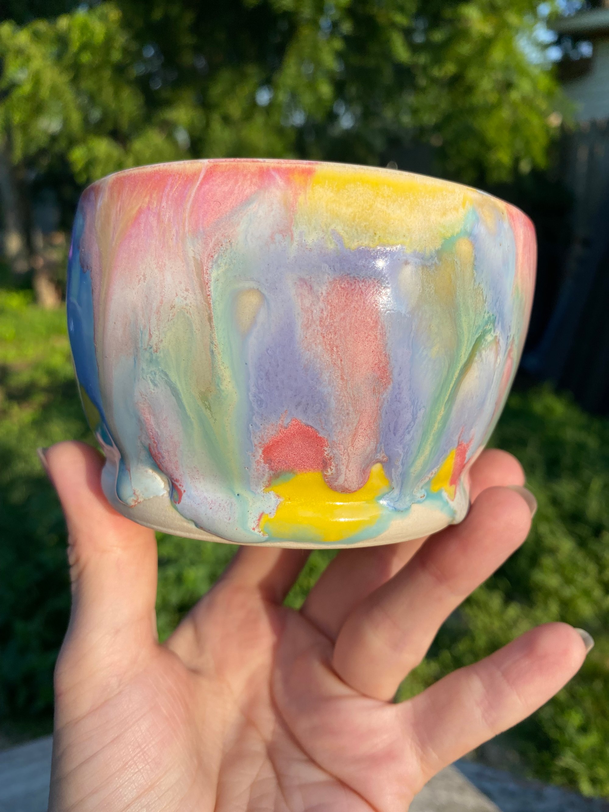 This rainbow planter stands 2.75 inches tall, is 4 inches wide, and has drainage holes at the bottom.